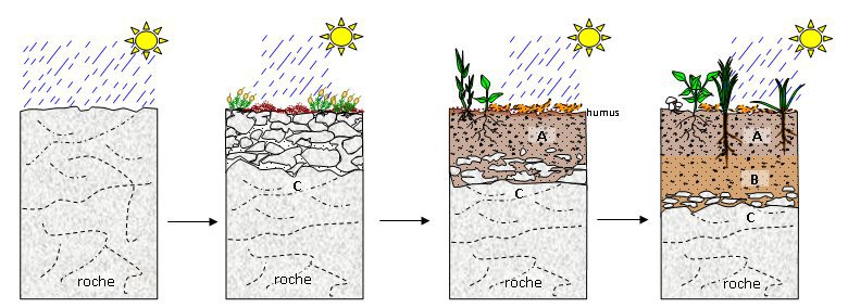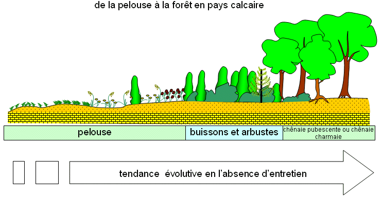 Au fur et à mesure que le temps passe, l'eau, le gel, le vent dégrade la roche et les végétaux en mourrant laisse de la matière organique au sol. De nouvelles plantes plus grandes peuvent alors s'installer sur ce sol pus profond et consititueront une pelouses très sèches où l'on voit encore affleurer la roche. La décomposition de ces végétaux et des matières organiques laissées par les animaux, enrichissent encore le milieu et une pelouse moins sèche s'installe. Lorsqu'aucune activité n'a lieu sur ces surfaces, les végétaux ligneux prennent le dessus. On aura alors des zones d'embuissonnement et la fermeture progressive du milieux conduit à une forêt de feuillus.