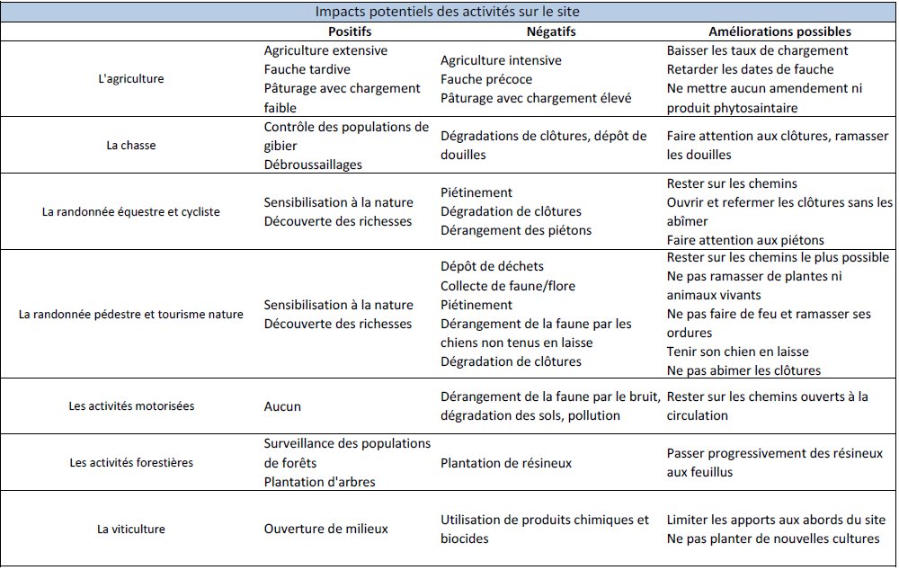 Les activités sur le site Voici un tableau qui synthétise la majorité des activités recensées sur le site et leurs impacts potentiels. Les impacts négatifs sont POTENTIELS, aussi ne vous sentez pas accusés si vous n'êtes pas concernés!
